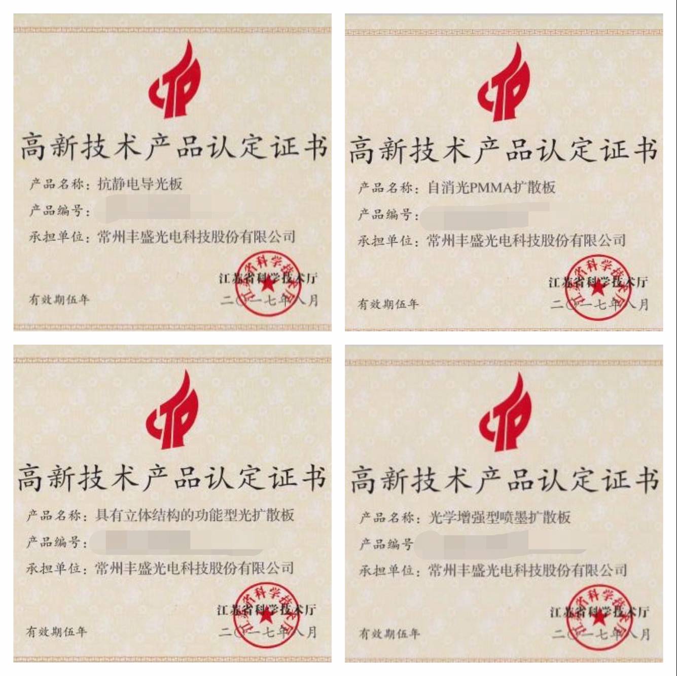 2017年,經(jīng)過本公司研發(fā)人員不斷努力研發(fā),起至今日,我公司新增了幾大新型產(chǎn)品,并于2017年9月獲得四項江蘇省高新技術(shù)產(chǎn)品認定申請證書。對應(yīng)產(chǎn)品分別是:光學(xué)增強型噴墨擴散板、具有立體形結(jié)構(gòu)的功能性光擴散板、自消光PMMA擴散板、抗靜電導(dǎo)光板。